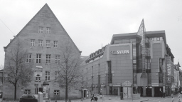einmal absieht). Das Nassauerhaus gilt als einziges in Nürnberg erhaltenes Beispiel eines mittelalterlichen Turmhauses. Von 1973 bis 1978 wurde das Nassauerhaus von Karstadt quasi umbaut. Die Fassadengestaltung löste zuvor leidenschaftliche Diskussionen aus. Zur Vermeidung irreversibler Bausünden einigte man sich auf die konventionelle Sandsteinfassade. In Fürth ist man traditionell weniger vorsichtig. Foto: A. Mayer. Ein Gebäude in exponierter Lage wird im Guten wie im Schlechten zum Aushängeschild, zur Visitenkarte; es zeigt, wie man sich selbst einschätzt und wie man eingeschätzt werden will. Dies gilt zuvorderst für Gebäude neben den wichtigsten Baudenkmälern (z.B. Rathaus, Stadttheater), aber auch für Bauten an den Eingängen der Stadt, vor allem zur Innenstadt. Ich weiß nicht, ob dies bei entsprechenden Entscheidungen in Fürth auch immer ausreichend bedacht und bewertet wird. Alexander Mayer |
