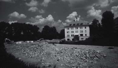 Nach dem Abriß der Halle A und des U-Baus ist nur das ehemalige Verwaltungsgebäude von der Zeit um 1950 übrig. Es wird jetzt als Rundfunkmuseum genutzt und liegt später im Uferpark. Vorn und hinten links die leeren Flächen, auf denen einstmals die Halle A und der U-Bau standen. Foto: A. Mayer. Im darauffolgenden Jahr 1950 entstand die riesige Montagehalle, die Zeitung titelte im März 1950: „‚Radio-Stadt‘ im Entstehen“. Diese Halle wurde noch in jüngster Zeit als „Musikhalle A“ benutzt, heute ist sie abgerissen und verschwunden. Ebenso der sogenannte UBau, das Labor-Gebäude und die Steinbaracken: Damit ist die Keimzelle der Weltfirma verschwunden, nur das ehemalige Verwaltungsgebäude hat als Rundfunkmuseum den Abriß überlebt. Mit über 3.000 Mitarbeitern in der Kurgartenstraße war das Werk im Jahr 1951 an die Grenzen seiner Kapazität gelangt und es begann die weltweite Ausdehnung mit schließlich fast 40.000 Mitarbeitern.