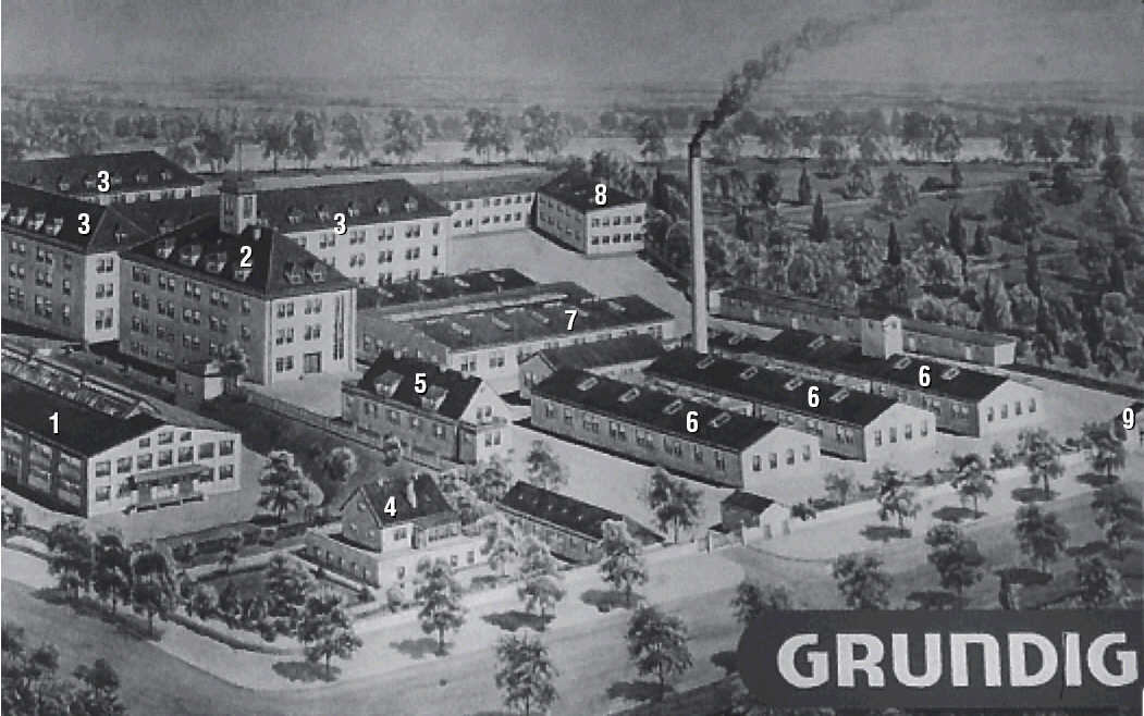 Das Bild zeigt die Ansicht der Firma Grundig etwa Ende 1950, im Ausschnitt hier die Teile, die schon Anfang 1950 standen. Links (1) ist die erst kürzlich abgerissene Halle A sichtbar, die noch fast bis zum Schluß für Aufführungen von Musicals genutzt wurde. Dahinter lagen die Garagen für den Fuhrpark zur Auslieferung Die Halle A war in den 1950er Jahren das Rückgrat der Serienfertigung. Die vorgefertigten Bauteile wurden aus dem sogenannten U-Bau links hinten (3) und aus den Steinbaracken (6,7) rechts vorne zur Endmontage in die Halle A angeliefert. In der linken Bildmitte (2) ist das 1949 entstandene Verwaltungsgebäude mit Turm sichtbar. Im Dachgeschoß waren die Wohnungen für den Finanzchef und den Entwicklungsleiter untergebracht, in der Bildmitte oben (8) das Laborgebäude. In dem Zweifamilienhaus in der Bildmitte (5) wohnten der Verkaufschef und die Mutter des Firmenchefs. Unten in der Bildmitte an der Ecke Kurgarten-Dr. Mack Straße (4) steht noch das Privathaus eines Fürther Bürgers. Später hat er vor den umgebenden Fabrikgebäuden aufgegeben und verkauft. Die Räume wurden dann für die Patentabteilung genutzt, bevor das ganze Haus für Umbauten an der Straßenfront abgerissen wurde. Oben rechts der ehemalige Eingang zum Kurgelände (9), der noch bis in die 1960er Jahre als Werkseingang genutzt wurde. Das Kurhaus – seinerzeit noch von der Spiegelglas- Union genutzt – ersetzte der Künstler aus optischen Gründen durch ein Wäldchen. Das Bild findet sich heute im Treppenhaus des Rundfunkmuseums. Foto: A. Mayer Auch die Stadt Fürth wurde durch das Kleeblatt-Wappen, von Grundig übernommen, weltbekannt. Die Arbeitskräfte, die zur Aufrechterhaltung des Betriebs notwendig waren, konnten in Fürth und Umgebung nicht mehr rekrutiert werden. Die Folge war eine lange Schlange von Omnibussen an der Dr. Mack und Kurgartenstraße, die zu Beginn und Ende der Arbeitszeit ins Land fuhren, um Arbeitskräfte heranzuschaffen und wieder nach Hause zu bringen, unvorstellbar in der heutigen Situation der Arbeitslosigkeit. Am Ende es Jahres 1950 konnte mit Recht behauptet werden, daß an der Kurgartenstraße Europas größte Spezialfabrik für Rundfunkgeräte stand. Mitte der 1950er Jahre kam auch das ehemalige Kurhaus dazu und wurde später nach einem Umbau Kasino und Chefsitz mit Stabsabteilungen.