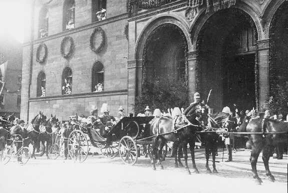 Die Welt ist noch (fast) in Ordnung: Am 29. Juli 1913 besucht der Prinzregent und spätere König Ludwig Fürth. Von Boykott-Aufrufen der Sozialdemokraten ließ man sich den Spaß nicht verderben. Paul Rieß schrieb: "Beim Rathause hatten weiß gekleidete Damen, die Offiziere der hiesigen Garnision und die Ehrenwache Platz genommen. Gegenüber hatten sich die vereinigten Sänger des Gauverbandes Fürth mit ihren Fahnen aufgestellt... Als die hohen Herrschaften vor dem Rathause angelangt waren, wurden sie von Herrn O.B. Kutzer im Namen der Stadt empfangen und von den dort stehenden, nach vielen tausenden zählenden Personen mit ungeheurem Jubel begrüßt. Vom Turme spielte die Artilleriemusik herab. Es war eine feierliche Stunde, die jedem Beiwohnenden unvergeßlich sein wird. Helle Freude und Patriotismus war auf allen Gesichtern ausgeprägt". Repro: A. Mayer. 1912: Entscheidung zum Krieg Kaiser Wilhelm II., Generalstabschef v. Moltke und Flottenchef Tirpitz stellten am 8. Dezember 1912 den Militärbevollmächtigten der deutschen Staaten das Szenario des Ersten Weltkrieges vor: Österreich solle gegen Serbien vorgehen. Wenn Rußland dann Serbien stütze, wäre der Krieg unvermeidlich. Wenn sich Rußland zu einem Krieg gegen Österreich habe provozieren lassen, sei Deutschland frei, um mit ganzer Kraft gegen Frankreich Krieg führen zu können. Die deutsche Flotte - v.a. U-Boote - müßten sich auf den Krieg gegen England einrichten. Generalstabschef von Moltke betonte wie so oft, ein europäischer Krieg sei unvermeidlich, und je eher er komme, desto besser. Allgemein wurde jedoch die Notwendigkeit gesehen, das Volk auf den Krieg einzustimmen. Flottenchef Tirpitz empfahl ein "Hinausschieben des Kampfes um 1 1/2 Jahre", bis der Kaiser-Wilhelm-Kanal für Großkampfschiffe ausgebaut und der U-Boothafen auf Helgoland fertiggestellt sei. Der Kaiser stimmte dem Aufschub des Krieges auf Mitte 1914 nur ungern zu. Zwei Tage später sprach der Kaiser gegenüber dem Gesandten der Schweiz vom unvermeidlichen "Rassenkrieg... des Slawentums gegen das Germanentum". Der "Rassenkampf" sei unvermeidlich, er werde voraussichtlich in ein bis zwei Jahren ausbrechen. Mit der These des "Rassenkampfes" befand sich der Kaiser in Übereinstimmung mit Generalstabschef v. Moltke, Reichskanzler Bethmann Hollweg und dem Auswärtigen Amt. Julikrise 1914 Es gibt zwar keine Beweise (sie schlummern vielleicht in den Archiven), aber doch ein paar Hinweise darauf, daß die Kriegsvorbereitungen schon im Gange waren, als am 28. Juni 1914 in Sarajewo der österreichische Thronfolger ermordet wurde. Einige maßgebende Personen in der Reichsleitung empfanden diesen Zwischenfall als ein Geschenk des Himmels: Der unsichere Bündnispartner Österreich-Ungarn konnte nun in den angestrebten Krieg reibungslos hineingezogen werden und damit die russische Armee in großen Teilen binden. Kaiser Wilhelm II. notierte am 30. Juni 1914: "... mit den Serben muß aufgeräumt werden, und zwar bald." Die deutsche Diplomatie drängte Österreich zum Losschlagen, wohl wissend, daß das mit Frankreich verbündete Rußland dem niemals tatenlos zusehen konnte. Die Mobilisierung in Rußland – ausgelöst zunächst durch die Kriegserklärung Österreich-Ungarns an Serbien und die Beschießung Belgrads – beantwortete man in Berlin mit umgehenden Kriegserklärungen an Rußland (1. August) und Frankreich (3. August), obwohl die deutsche Reichsleitung sehr wohl wußte, daß die träge russische Mobilisierung noch lange kein Angriff bedeuten mußte, wofür der Zar dem deutschen Kaiser im übrigen sein Wort gegeben hatte. Schon vor der Kriegserklärung an Frankreich erging an das neutrale Belgien ein Ultimatum, daß es den Durchmarsch deutscher Truppen durch Belgien nach Frankreich zu genehmigen habe. Belgien lehnte umgehend ab, was Deutschland aber nicht hinderte, am 4. August in Belgien einzumarschieren. Der Angriff begann gegen Frankreich, obwohl Deutschland vorgeblich durch die russische Mobilmachung zum Krieg gezwungen gewesen sei. Österreich Ungarn erklärte Rußland erst am 6. August nach drängenden Mahnungen aus Berlin den Krieg. Wien beendete somit die groteske Situation, daß sich Deutschland sechs Tage früher im Kriege mit Rußland befand als Österreich-Ungarn, dessentwillen es - nach eigener Darstellung gegenüber der Weltöffentlichkeit - den Kampf überhaupt aufnahm. Tatsächlich hatten sich zwischen Österreich-Ungarn und Rußland gewisse Anzeichen zur Entspannung aufgetan und zu einem Verhandlungsansatz verdichtet. Aber die treibende Kraft zum Weltkrieg war Deutschland, und Deutschland hatte mit seiner Kriegserklärung an Rußland am 1. August vollendete Tatsachen geschaffen. Der deutschen Reichsleitung gelang es zwar nicht, die Weltöffentlichkeit zu täuschen, sehr wohl jedoch die eigene Bevölkerung. Im Deutschen Reich war man der festen Überzeugung, der deutsche Angriffskrieg sei reine Notwehr. In Deutschland - aber auch in anderen Ländern - steigerten sich große Teile der Bevölkerung in eine Kriegsbegeisterung hinein, das "Augusterlebnis" ließ scheinbar alle gesellschaftlichen Konflikte vergessen. Julikrise in Fürth Paul Rieß erwähnt die zum Ersten Weltkrieg führende Julikrise erstmalig am 25. Juli 1914, an dem auch der Ehrenabend für die siegreiche SpVgg stattfand (erste deutsche Meisterschaft): "Der Abbruch der diplomatischen Beziehungen zwischen Oesterreich und Serbien versetzte die hiesige Bevölkerung in starke Aufregung. Die Depeschentafeln der Zeitungen waren fortgesetzt belagert. Extra-Blätter erscheinen. Man denkt allgemein, daß ein Weltkrieg zum Ausbruch kommt". Am 26. Juli notierte der Chronist: "Auf den Straßen und in den Wirtschaften ging es heute lebhaft zu. Die hiesige Bevölkerung (ebenso im ganzen Deutschen Reich) sieht mit Spannung der Entwicklung des österreichisch-serbischen Konfliktes entgegen. Extraausgaben der Zeitungen erscheinen. Die Sympathie ist auf Seite Oesterreichs. Bis spät in die Nach