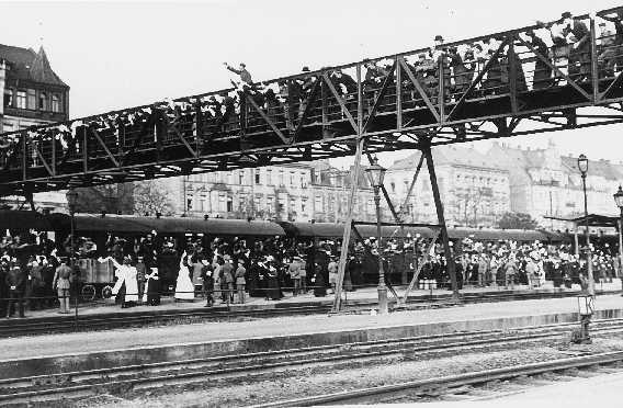"Augusterlebnis": Die in Fürth stationierten Truppen verließen am 7. und 8. August 1914 "unter nicht enden wollenden Hurra- und Abschiedsrufen" den Standort. Die Fußgängerüberführung im Bild existiert nicht mehr, sie stürzte 1920 ein. Repro: A. Mayer. Im Westen nichts Neues Alle Durchbruchsversuche beider Seiten schlugen 1914 fehl, eine über 700 Kilometer lange Front von der Nordsee bis zur Schweizer Grenze erstarrte im Stellungskrieg, an den Frontabschnitten lagen die vordersten Gräben oft kaum 50 Meter von den feindlichen Stellungen entfernt: "Granattrichter von 3 m Tiefe und 10-12 m Durchmesser liegen vor und hinter den Geschützständen, – es ist eine richtige Wildnis. Und so wie in unserer Feuerstellung, so sieht es in dem ganzen, großen, herrlichen Eichenwald aus. Seit 10 Tagen haben wir zum ersten Mal dauernd Sonnenschein, da läßt sich alles noch ertragen, aber grausig waren die ersten Wochen mit ihrem unaufhörlichen Regen, der alles ringsum in Sumpf verwandelte. Man konnte keine 10 Schritt weit gehen, ohne daß man bis an die Knie versank... So tobten wir durch die Gegend, ewig im schwersten Feuer, ohne jede Deckung. Alle Augenblicke warf man sich hin, wo man stand und ging, um nicht getroffen zu werden, von oben bis unten mit dicker feuchter Lehmkruste bedeckt, suchten wir abends ein Stündchen Schlaf in den Unterständen, in denen das Wasser stand. Vor Ungeziefer und Nässe und Kälte konnten wir nicht schlafen, stürzten ans Geschütz und lösten die todmüden Kameraden ab, nur daß wir warm wurden... Und dann kamen die Tage, an denen uns die Franzosen entdeckt hatten, als die Geschütze Volltreffer bekamen, als alles half und einsprang und daneben lagen und brüllten vor Schmerzen die halbverkohlten Kameraden und keiner konnte helfen..." Entsprechende Berichte wurden jedoch zurückgehalten, anderes in den Vordergrund gestellt, so zeigt Paul Rieß exemplarisch, was der Mann aus dem Volke – und das war Rieß – wahrnahm, wenn er nicht von der Feldpost eigener Verwandter eines besseren belehrt wurde: 4. Dezember 1914. "Bis jetzt haben aus hiesiger Stadt u. Garnison 170 Helden das Eiserne Kreuz erhalten. Der jüngste Träger dieser Ehrenauszeichnung ist der 16 1/2jährige Sohn des Cigarrenhändlers Justus Bendit in der Weinstrasse. Der Tapfere dient als Kriegsfreiwilliger beim 21. Inf. Regiment. Er ist Israelit." 17. Dezember 1914: Nachmittags um 2 Uhr erreicht Fürth die Nachricht, daß "der russische Generalangriff auf die schlesische und posenische Ostmark völlig gescheitert" ist. "In den Straßen standen truppenweise die Leute beisammen, ebenso in den Büros und Fabriken. Das Rathaus und alle Straßen waren im Nu mit deutschen, österreichischen, ungarischen und bayerischen Fahnen geschmückt. Sogar einige türkische Fahnen waren darunter. Die Michaelskirche ließ als erste den ehernen Klang ihrer Glocken ertönen, das schöne Geläute des Rathauses folgte und bald darauf alle Kirchenglocken. Das Läuten währte 1 Stunde lang. Abends 7 Uhr zog die Wehrkraftkapelle vor das Rathaus und unter schneidigen Märschen durch die Straßen der Stadt, gefolgt von einer ungeheuren Menge Menschen. Nach dem Abendgottesdienst hielt Stadtpfarrer Fronmüller von der Freitreppe aus eine begeisterte Ansprache. Ein Hoch auf unseren Kaiser, auf Hindenburg und auf unser Heer im Osten und im Westen, zu Wasser, zu Land und in der Luft und der Gesang 'Deutschland, Deutschland über alles' beschloß die erhebende Feier".