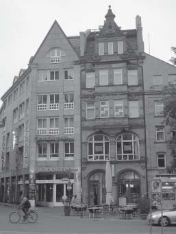 Neu und Alt nebeneinander in der Nürnberger Königstraße (49/51). Der Neubau links ordnet sich gestalterisch dem Neurenaissancebau rechts unter und bleibt im Maßstab, bringt dabei zwar keine eigene Idee ein, was aber in jedem Fall besser ist wie so manche Selbstverwirklichungsorgie eines ungezügelten Planers. Foto: A. Mayer. Es gibt natürlich auch gelungene