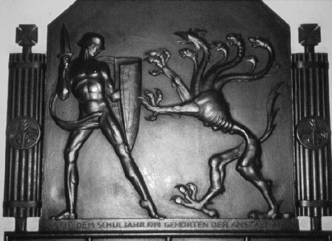 Eine typische Interpretation des Ersten Weltkrieges nach 1918: Der deutsche Soldat kämpft wie ein griechischer Sagenheld – Inbegriff der Tugend - gegen ein mehrköpfiges Ungeheuer, das die Vielzahl heimtückischer Feinde versinnbildlichen soll. Es scheinen zwar verschiedene Deutungsmöglichkeiten offen, aber die Faszes (Rutenbündel) links und recht – Sinnbild für Recht und Einigkeit – deuten schon an, daß der Feind nach dieser Interpretation auch innen stand. Das Relief ist im ersten Stock des Hardenberg-Gymnasiums (Kaiserstraße 92) zu finden. Foto: A. Mayer. Sonderrolle von Fürth? Unser Fürth galt bis zum Ersten Weltkrieg als ein Ort der beispielhaften Toleranz gegenüber Juden, wenngleich mitunter der Verdacht geäußert wird, diese Einschätzung sei eine nachträgliche Verklärung. Auch Jakob Wassermann belegt nämlich, daß es mit der Toleranz in Fürth nicht so weit her gewesen sein kann: "Die meinem Judentum geltenden Anfeindungen, die ich in der Kindheit und ersten Jugend erfuhr, gingen mir, wie mich dünkt, nicht besonderes nahe, da ich herausfühlte, daß sie weniger die Person als die [jüdische] Gemeinschaft trafen. Ein höhnischer Zuruf von Gassenjungen, ein giftiger Blick, abschätzige Miene, gewisse wiederkehrende Verächtlichkeit, das was alltäglich." Zwar gibt es viele Einzelbeispiele des guten Verhältnisses auf der Ebene der gesellschaftlich bestimmenden Schichten, vereinzelt auch Beispiele für die breite Bevölkerung etwa in Form einer positiven Abstimmungen über den gemischten Religionsunterricht 1869, aber auch hier ist Vorsicht geboten. Einerseits stammen die positiven Beispiele in Fürth bis auf wenige Ausnahmen aus der Zeit vor dem allgemeinen Wiederaufleben des deutschen Antisemitismus ab etwa 1879. Weiterhin ließ sich auch andernorts, wie zum Beispiel in der Umgebung des Kaisers, eine widersprüchliche Situation ausmachen: Der Kaiser empfing zahlreiche jüdische Bürger und hörte auch auf ihren Rat, genannt seien Albert Ballin (Generaldirektor der Hapag), Emil und Walter Rathenau (Emil R.: Generaldirektor der AEG; Walter R.: Vorstandsmitglied der AEG, Geschäftsinhaber der Berliner Handelsgesellschaft), die Bankiers Max Warburg, A. Salomonsohn und Carl Fürstenberg sowie den Industriellen Fritz von Friedländer-Fuld. Meist waren die jüdischen Familien zum Christentum übergetreten, bevor sie durch Nobilitierung und Verleihung von Ordensauszeichnungen in den Kreis der "besseren" Gesellschaft aufgenommen wurden, aber es gab auch Ausnahmen wie der Bankier Gerson v. Bleichröder, der bei seinem jüdischen Glauben blieb und dennoch geadelt wurde. Dies alles konnte aber nicht darüber hinwegtäuschen, daß die adlige Gesellschaft, Minister, Bürokraten und Offiziere den Juden die Gleichberechtigung versagten und in diesen Kreisen ein latenter Antisemitismus vorherrschte, gerade auch seitens des Kaisers und seiner engsten Umgebung sind antisemitische Äußerungen und Einstellungen überliefert. In breiten mittelständischen und bäuerlichen Schichten, die ihre soziale Stellung durch die fortschreitende Industrialisierung bedroht sahen, machte sich dagegen ein unverhüllter Antisemitismus breit. Es bleibt meiner Meinung nach eine vorerst unbeantwortete Frage, ob und inwiefern dies in Fürth Ende des 19./Anfang des 20. Jahrhunderts prinzipiell anders gewesen ist. Ich tendiere bei der Antwort eher zu einem Nein, vor allem wenn man sich die weitere Entwicklung vor Augen hält.